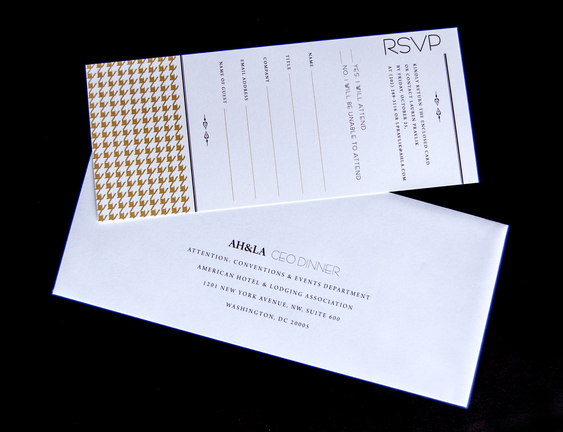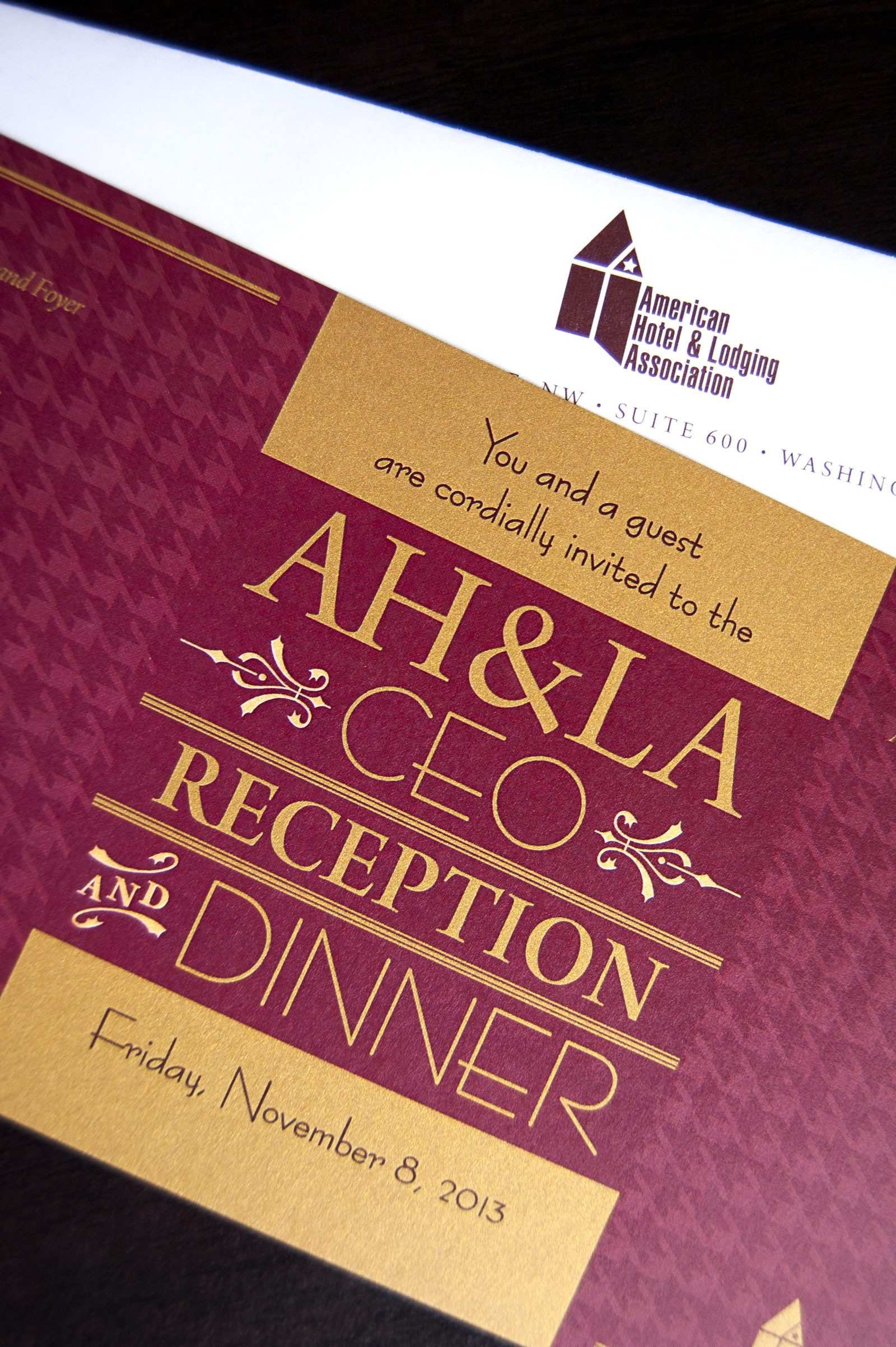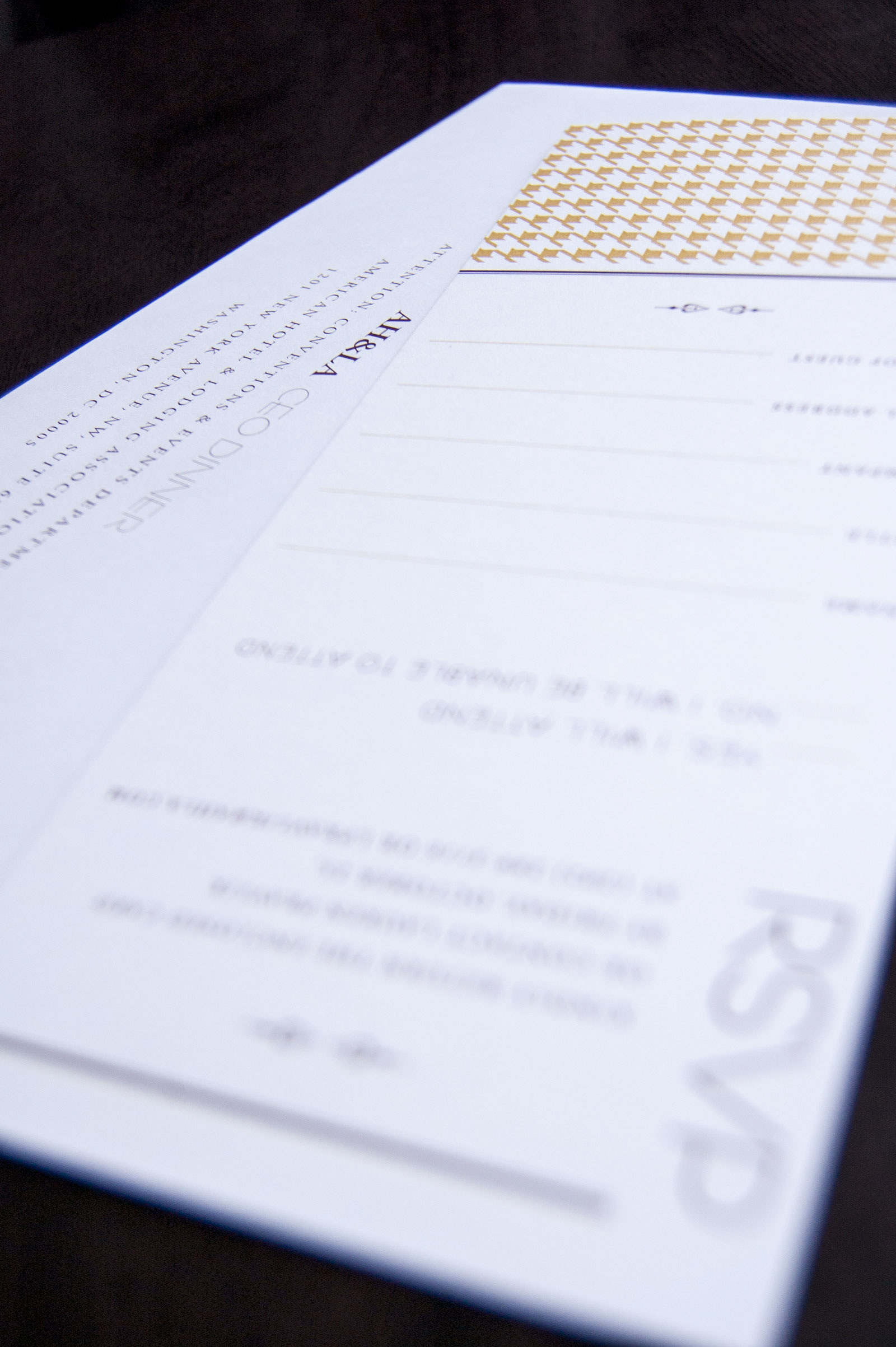 The invitation alludes to a current trend while maintaining an upscale, elegant feel. The choice of the nexpress gold metallic ink adds flair to reinforce the upscale direction.